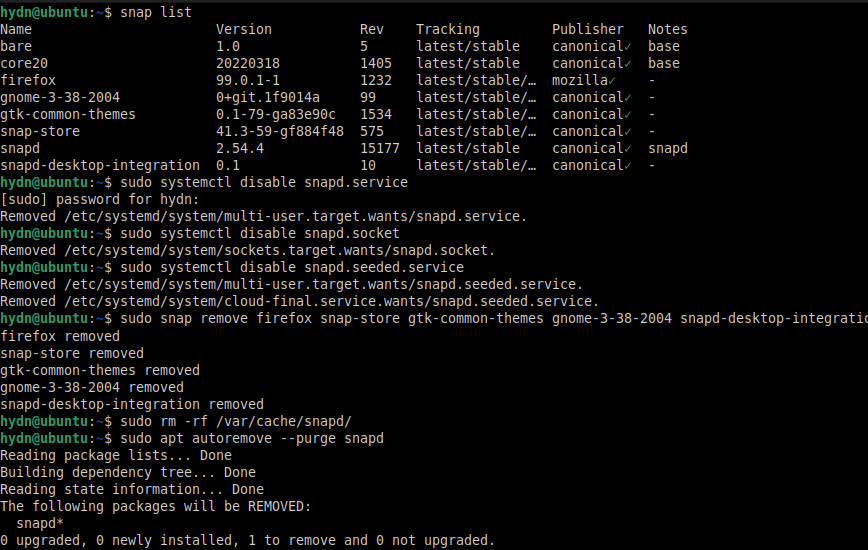 sudo apt autoremove --purge snapd