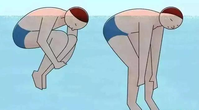 # 2. 水中站立:「弯腰双手抱膝, 屁股下坐,待身体直立后伸直双腿」。