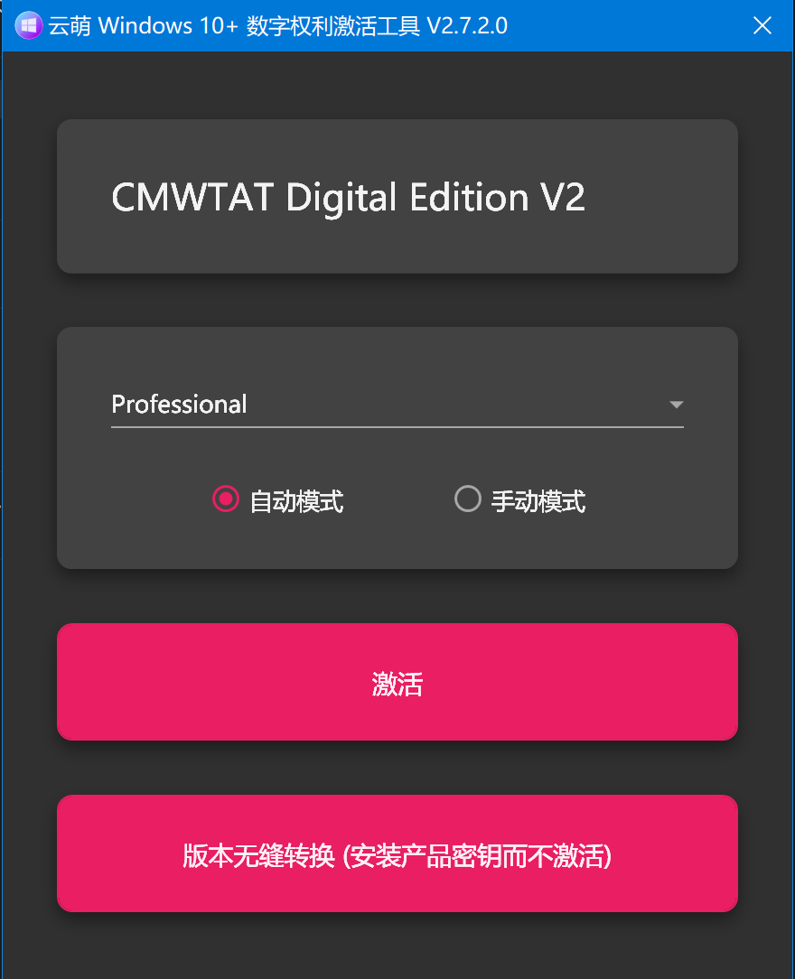 - 云萌数字权利激活工具(推荐): 仅支持数字权利这一种激活方式,只能用于激活 Windows,亮点功能是切换版本非常方便,良心出品,代码完全开源。